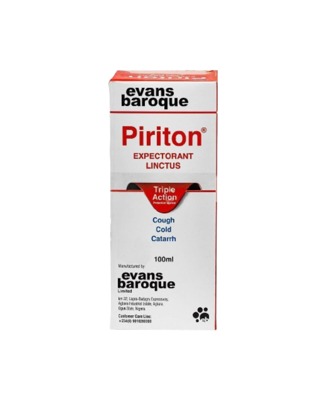 Piriton Triple Action Syrup combines antitussive and expectorant effects to suppress cough while aiding mucus clearance for effective respiratory relief.