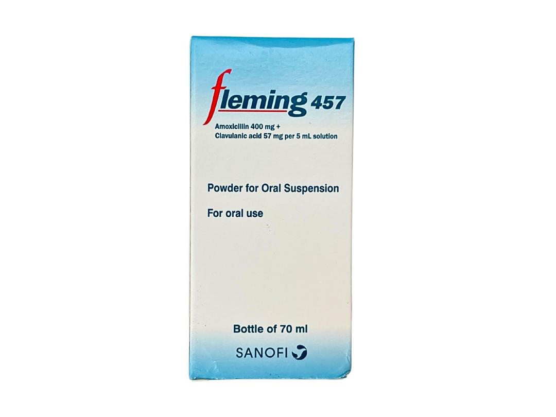 Fleming 457 is an oral antibiotic medication provided as a powder for oral suspension. Once reconstituted, each 5 mL dose contains Amoxicillin (400 mg) and Clavulanic acid (57 mg). It belongs to the penicillin-type antibiotic class and is used to treat a wide variety of bacterial infections.