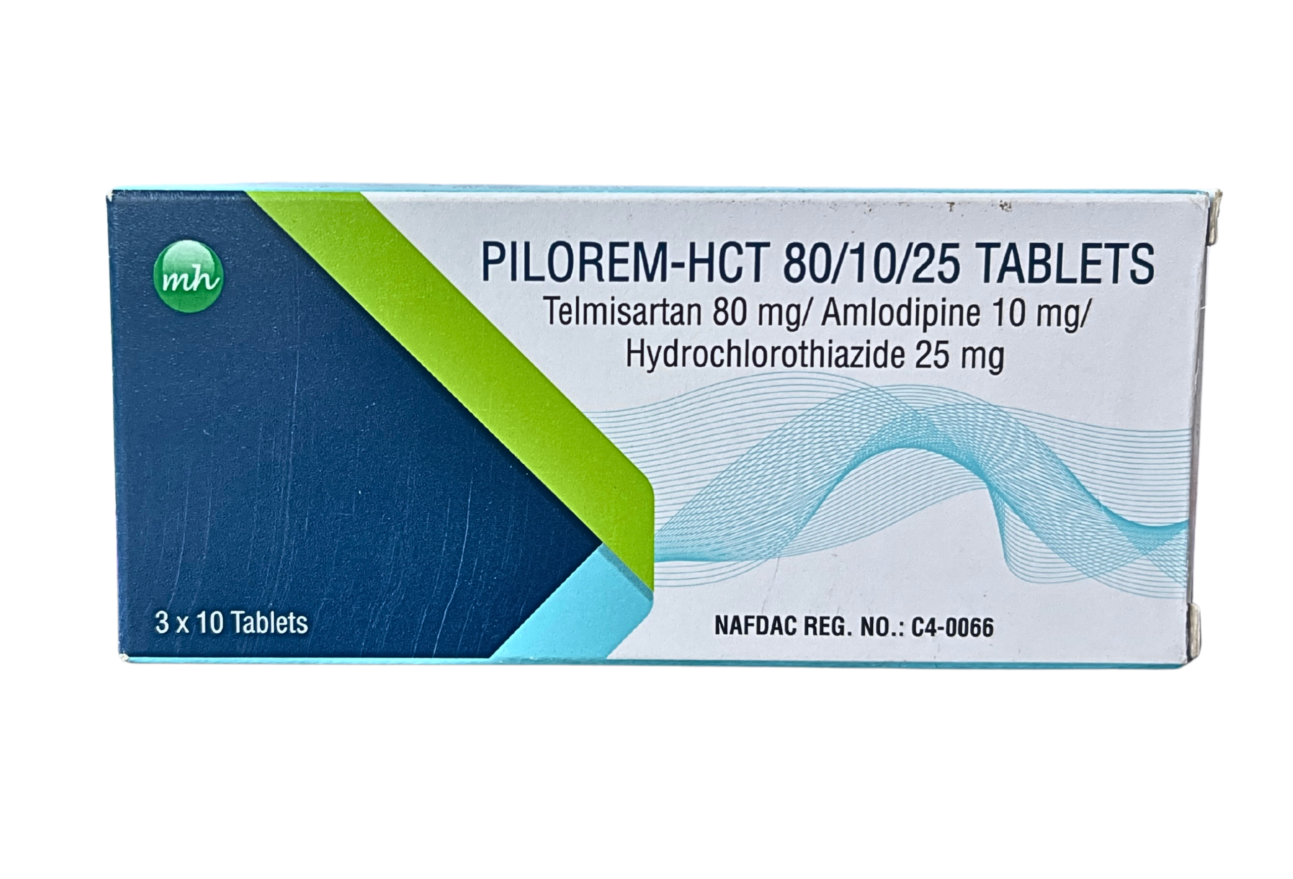 Pilorem-HCT 80/10/25 is a triple-combination oral cardiovascular medication containing three active ingredients: Telmisartan (80 mg), Amlodipine (10 mg), and Hydrochlorothiazide (25 mg). It is indicated for the treatment of essential hypertension (high blood pressure) in patients whose blood pressure is not adequately controlled by dual-therapy combinations.