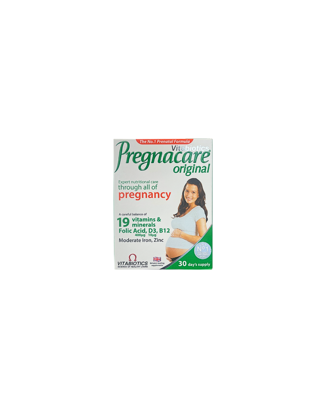 Pregnacare Original is a prenatal multivitamin supplement designed to support women before conception, during pregnancy, and while breastfeeding. It contains essential nutrients such as folic acid, vitamin D, iron, and other vitamins and minerals that help support maternal health and the normal development of the baby.