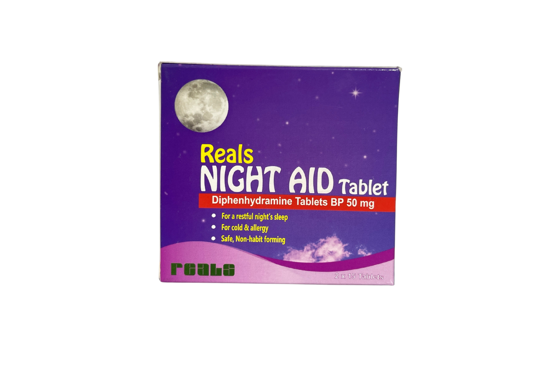 Reals Night Aid contains diphenhydramine, which can help with occasional sleeplessness and nighttime allergy symptoms.