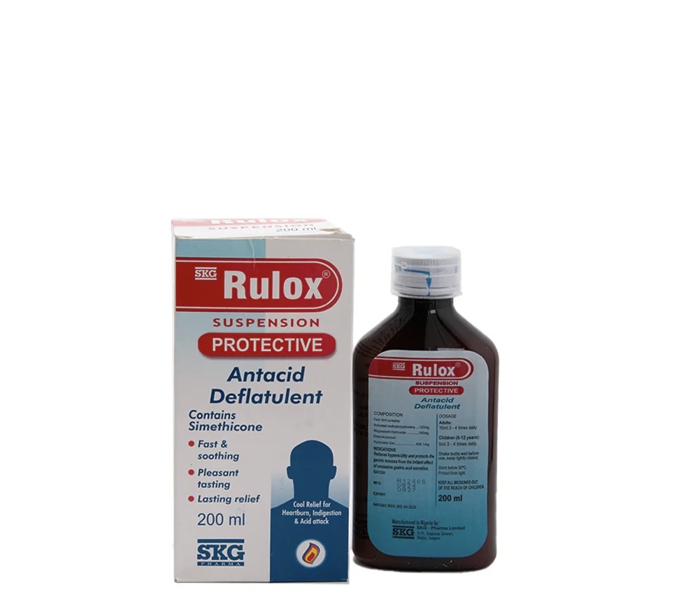 Rulox Suspension is an oral antacid medication used to relieve symptoms associated with excess stomach acid such as heartburn, acid indigestion, and stomach discomfort. It typically contains a combination of aluminum hydroxide, magnesium hydroxide, and simethicone, which work together to neutralize stomach acid and reduce gas in the digestive tract.