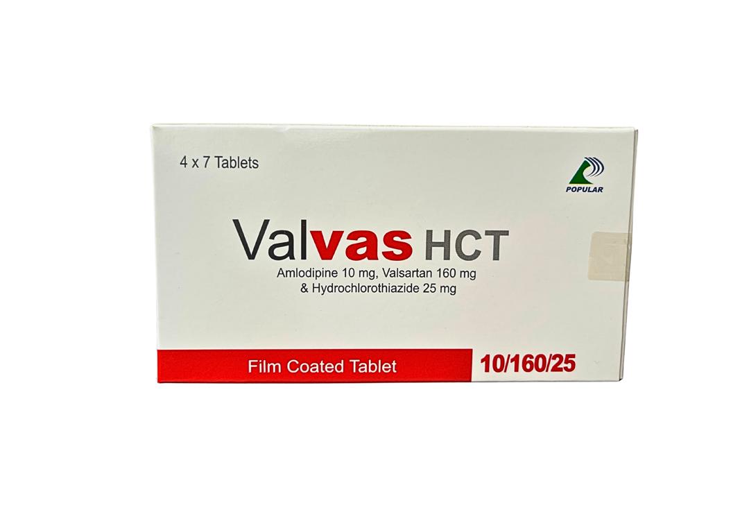 Valvas HCT is an oral antihypertensive medication containing a triple combination of three active ingredients: Amlodipine (10 mg), Valsartan (160 mg), and Hydrochlorothiazide (25 mg). It is used to improve blood pressure control in adults with hypertension.